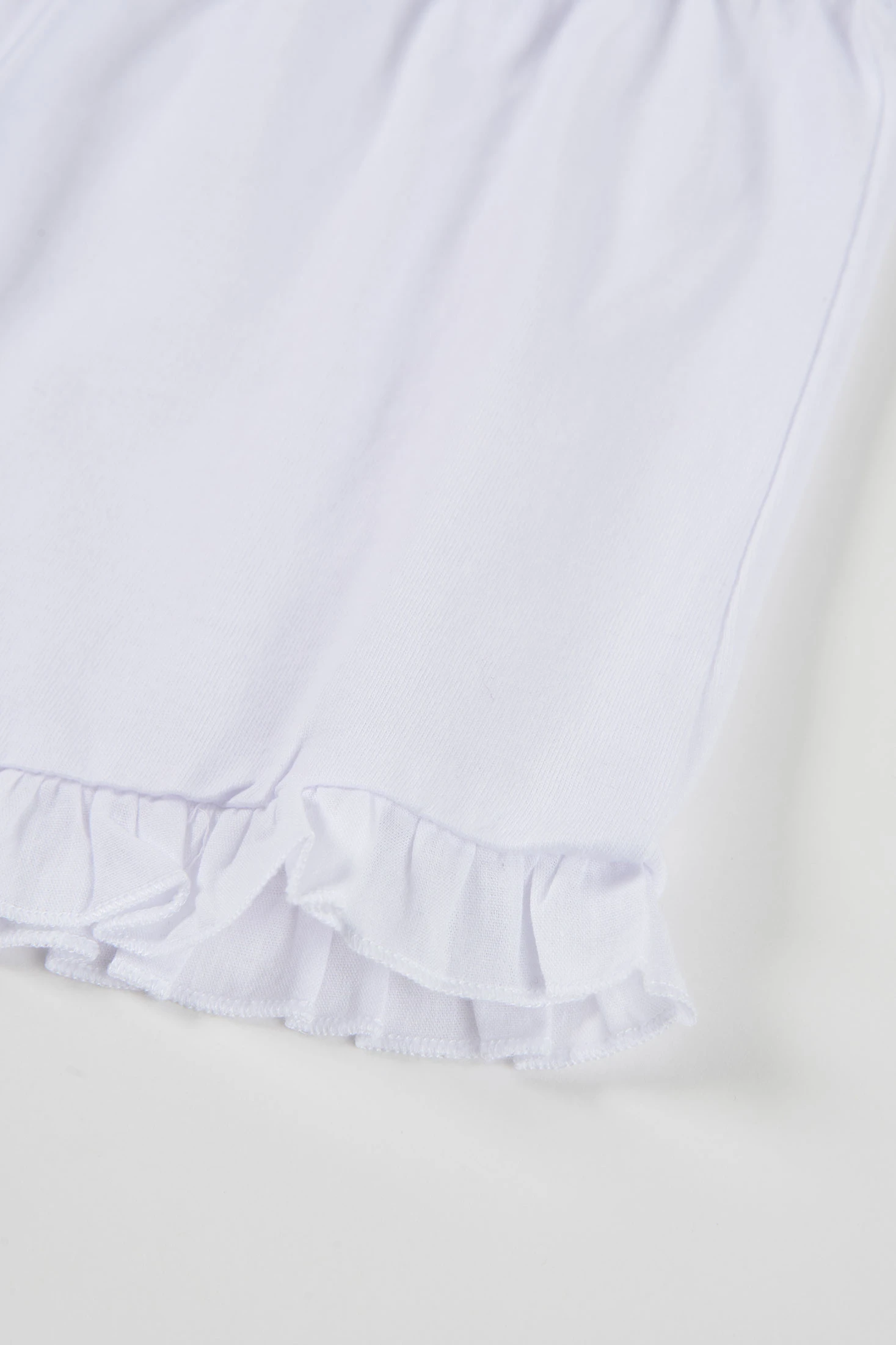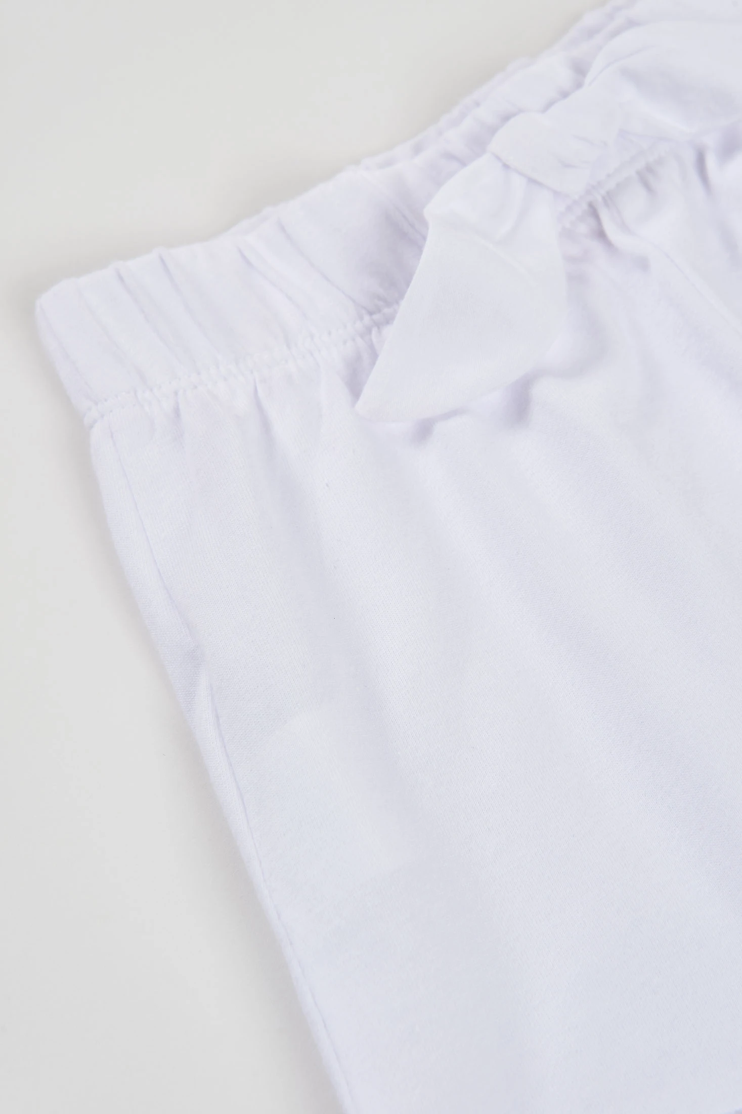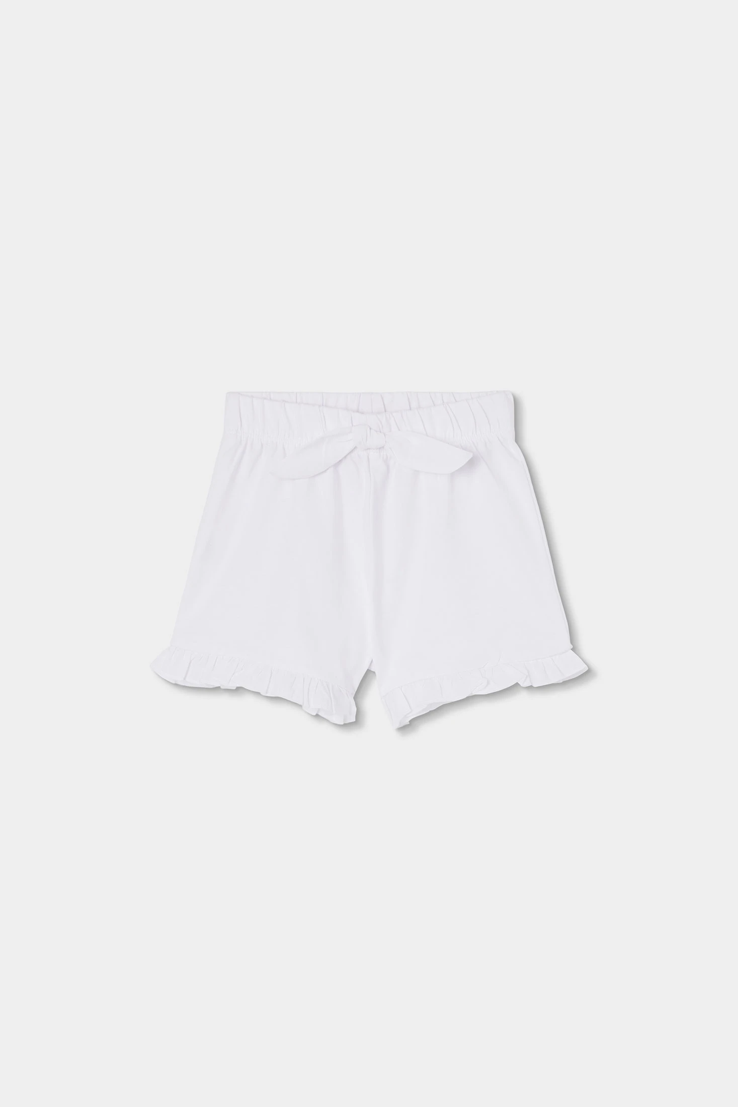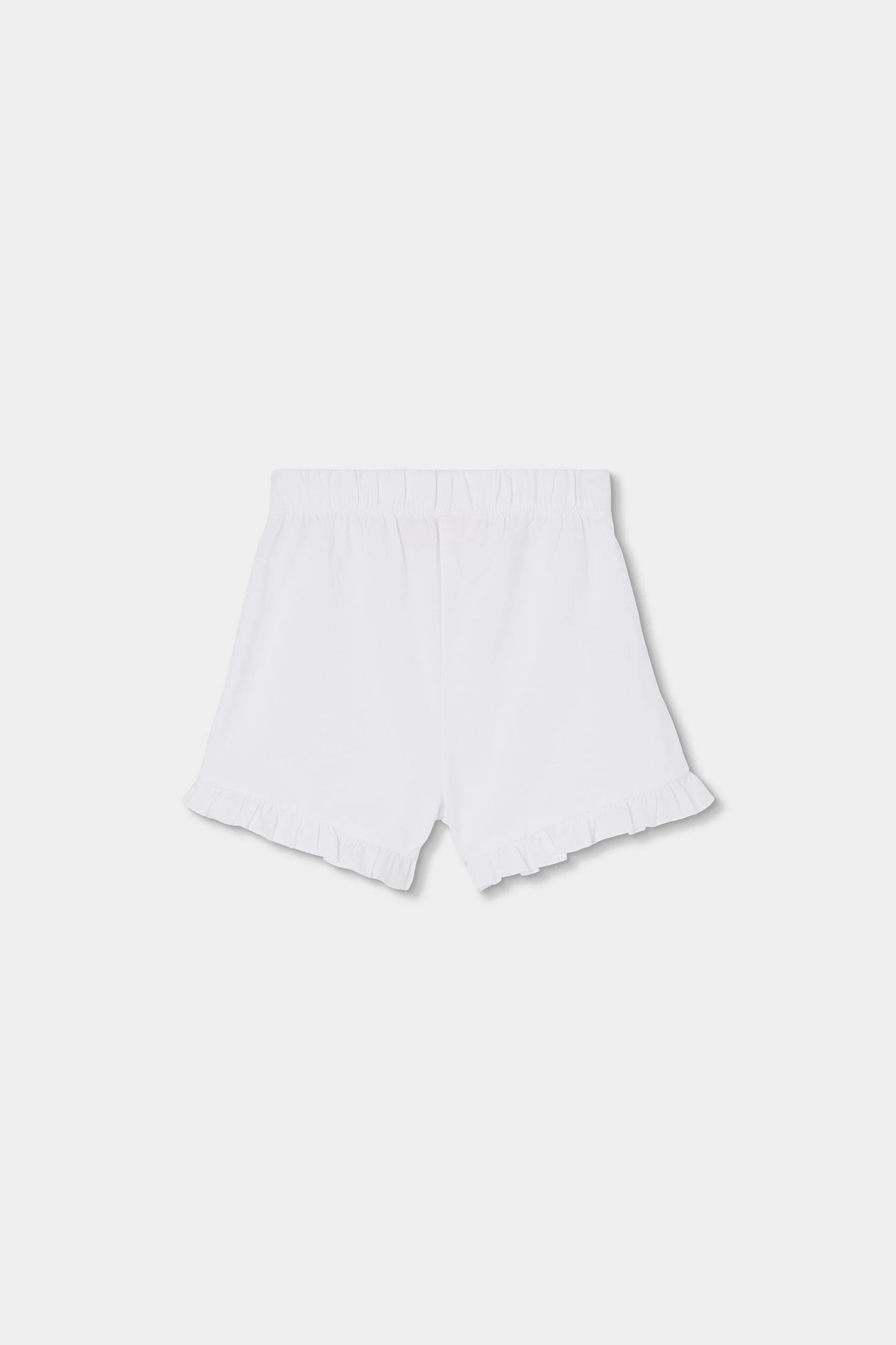 Knitted shorts with frills in white, perfect for girls, offering comfort and style. Simple design with frills at the hem and a decorative bow at the waist adds a playful touch. Available in sizes from 2 years to 14 years, suitable for all ages. Versatile style that allows easy pairing with other plain or patterned garments, making these shorts an ideal choice for this summer.