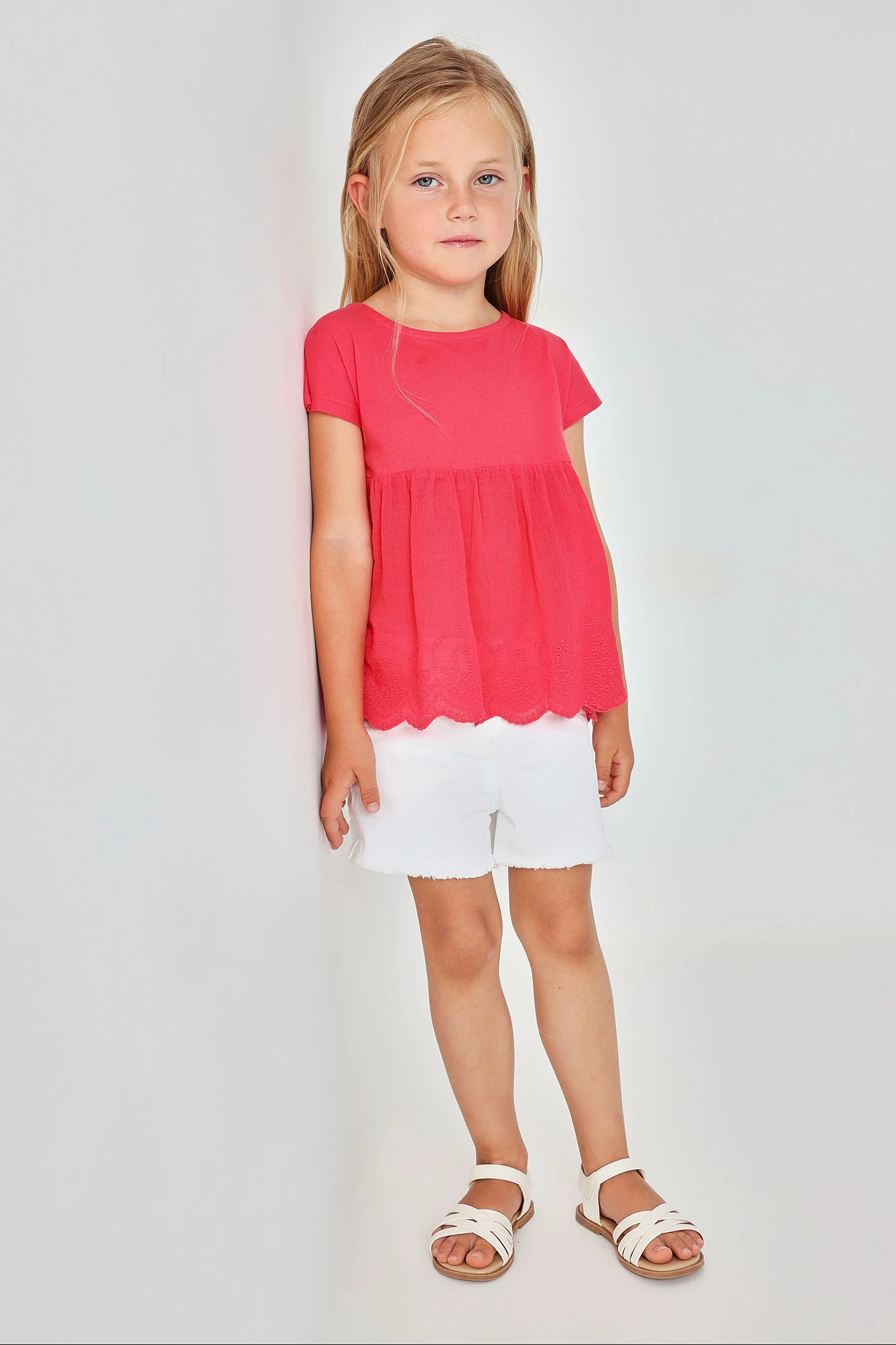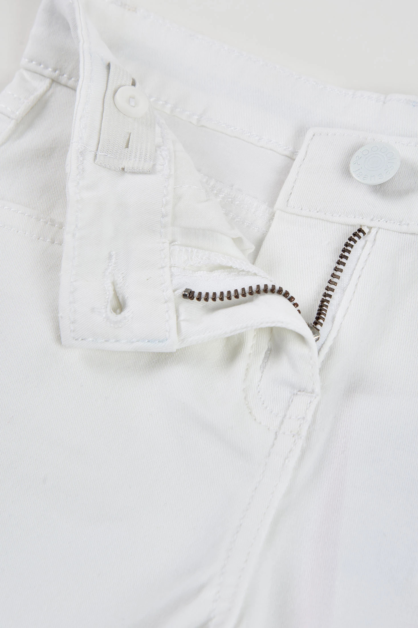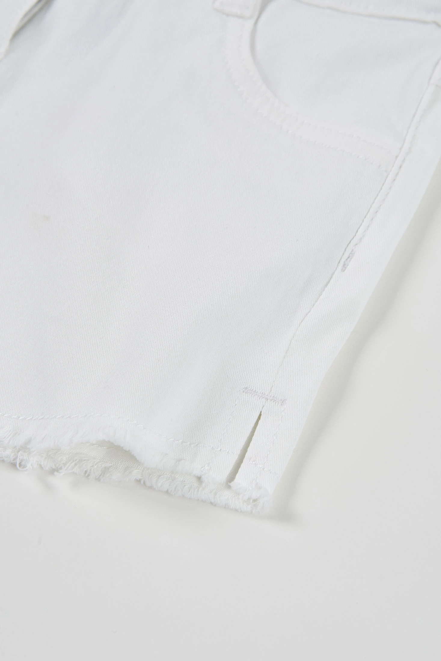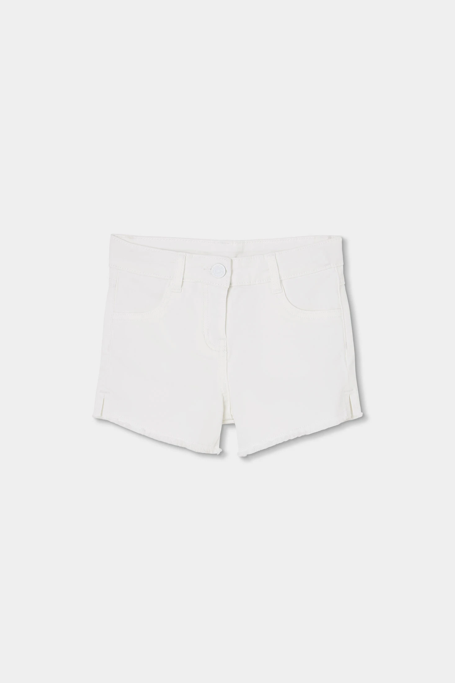Elastic twill shorts in white for girls, a versatile choice for summer, made from durable material offering both durability and comfort. Its simple design allows for easy pairing with various garments to create casual looks. Available in sizes from 12 months to 14 years, it adapts to the growth of children. Details include a button closure and functional pockets. Perfect for warm days, these shorts combine style and functionality, making them a basic item in a child's wardrobe.