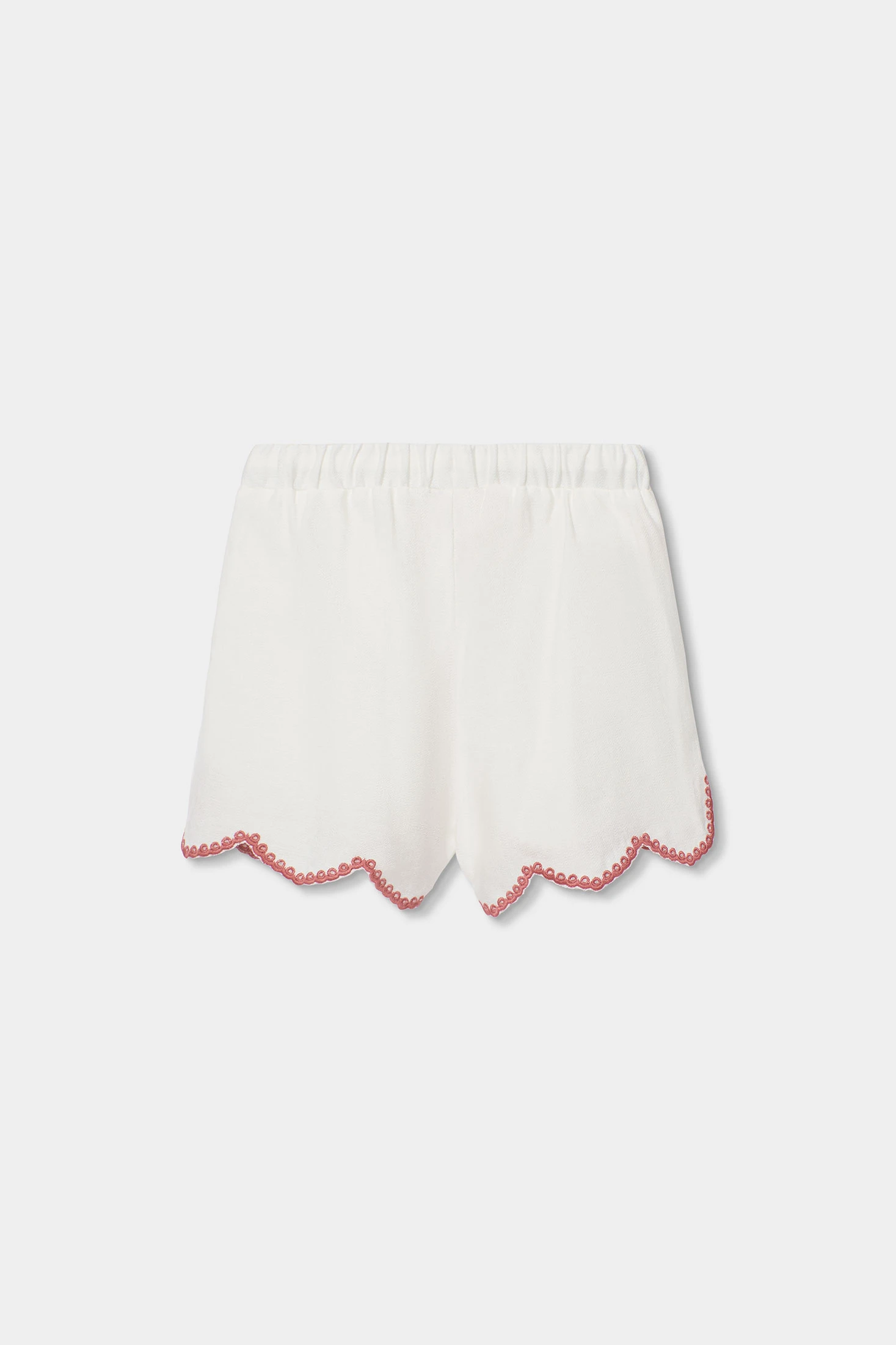 White fantasy fabric Bermuda shorts, ideal for summer days, offering comfort and freshness. They feature coloured embroidered details on the sides and a scalloped hem, adding a fun and colourful touch. Their functional design includes an elastic waistband with a drawstring, fitting well for children aged 12 months to 10 years. They are perfect for pairing with light t-shirts or blouses, creating a fresh and summery look, ideal for outdoor activities and playtime.