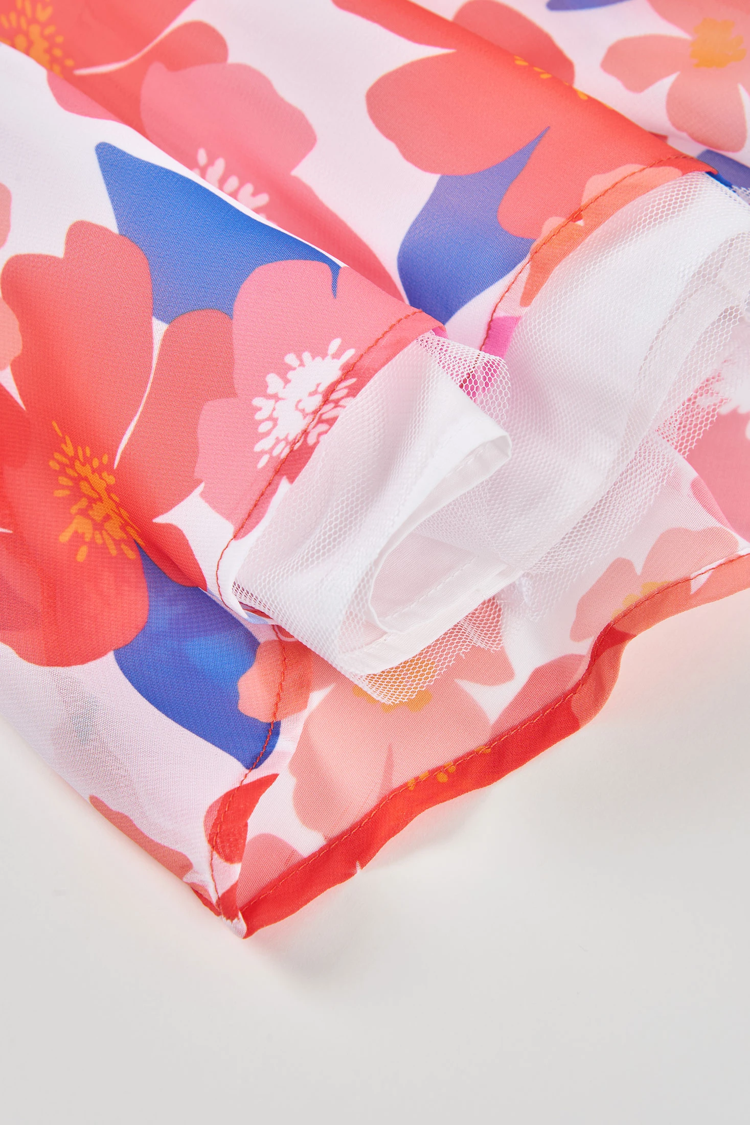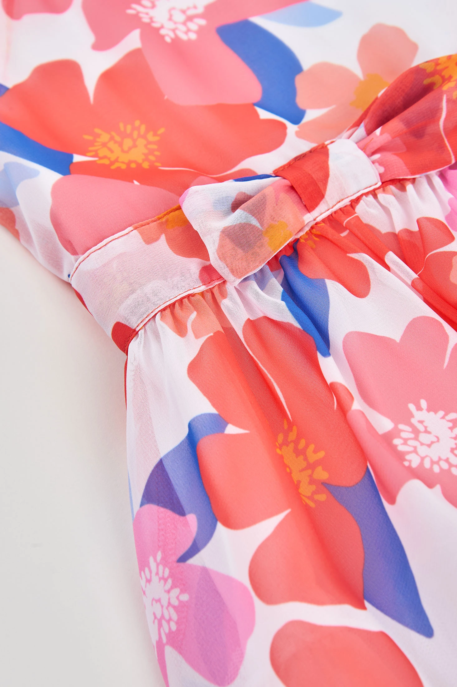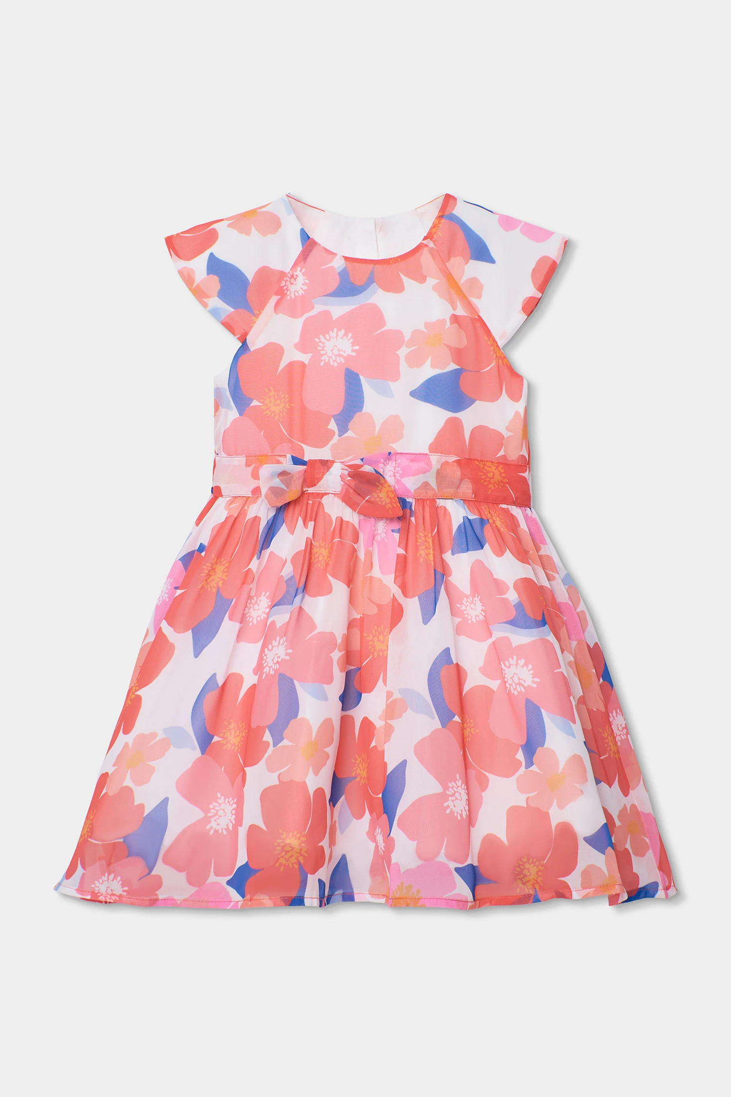 Chiffon dress ideal for girls, featuring a floral print in shades of pink and blue that evoke freshness and joy. The chiffon provides lightness and movement, perfect for warm seasons. Its design includes short sleeves and a bow at the waist, adding a touch of elegance to the garment. Available in sizes from 12 months to 10 years, it is a versatile option for special occasions. It can be paired with simple accessories to complete an elegant and comfortable look for the little ones.