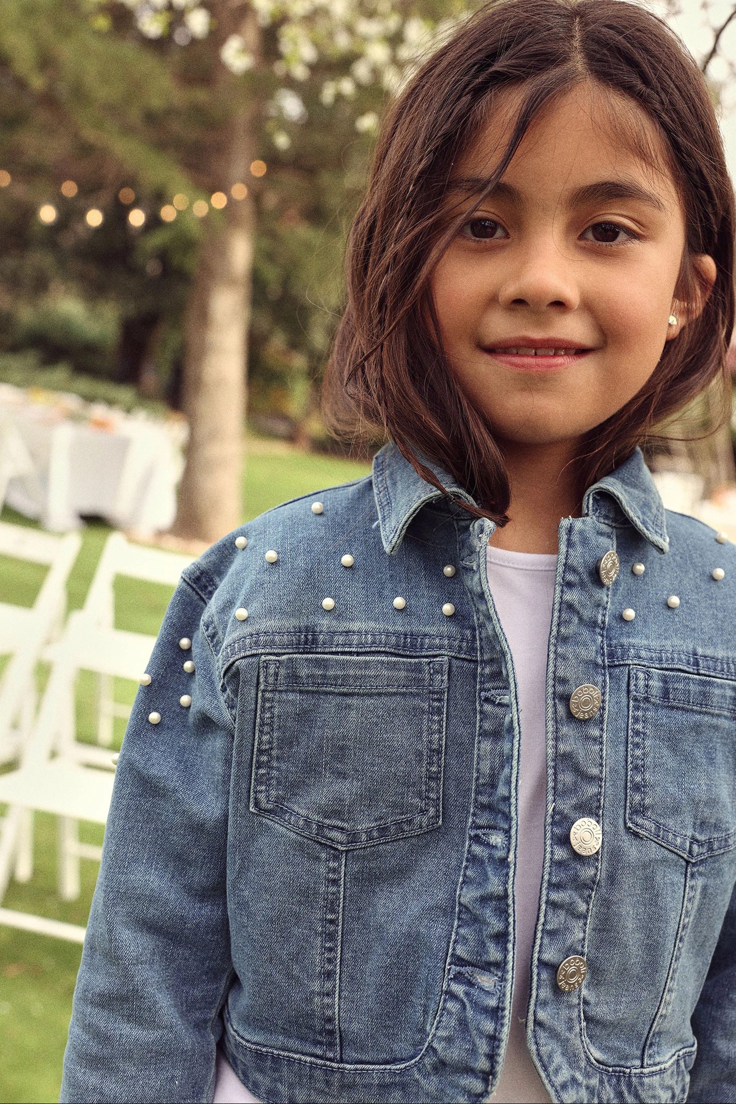 Denim jacket for girls, ideal for a casual and modern look. Made from light blue denim fabric, it stands out with its design featuring small decorative embossed details that add a chic touch. It includes a front button closure and flap pockets on the chest. Designed for comfort, it is perfect for girls aged 2 to 14 years. You can easily pair it with dresses or trousers for a versatile and relaxed style. The long sleeves and classic cut make it a timeless and practical garment for various occasions.
