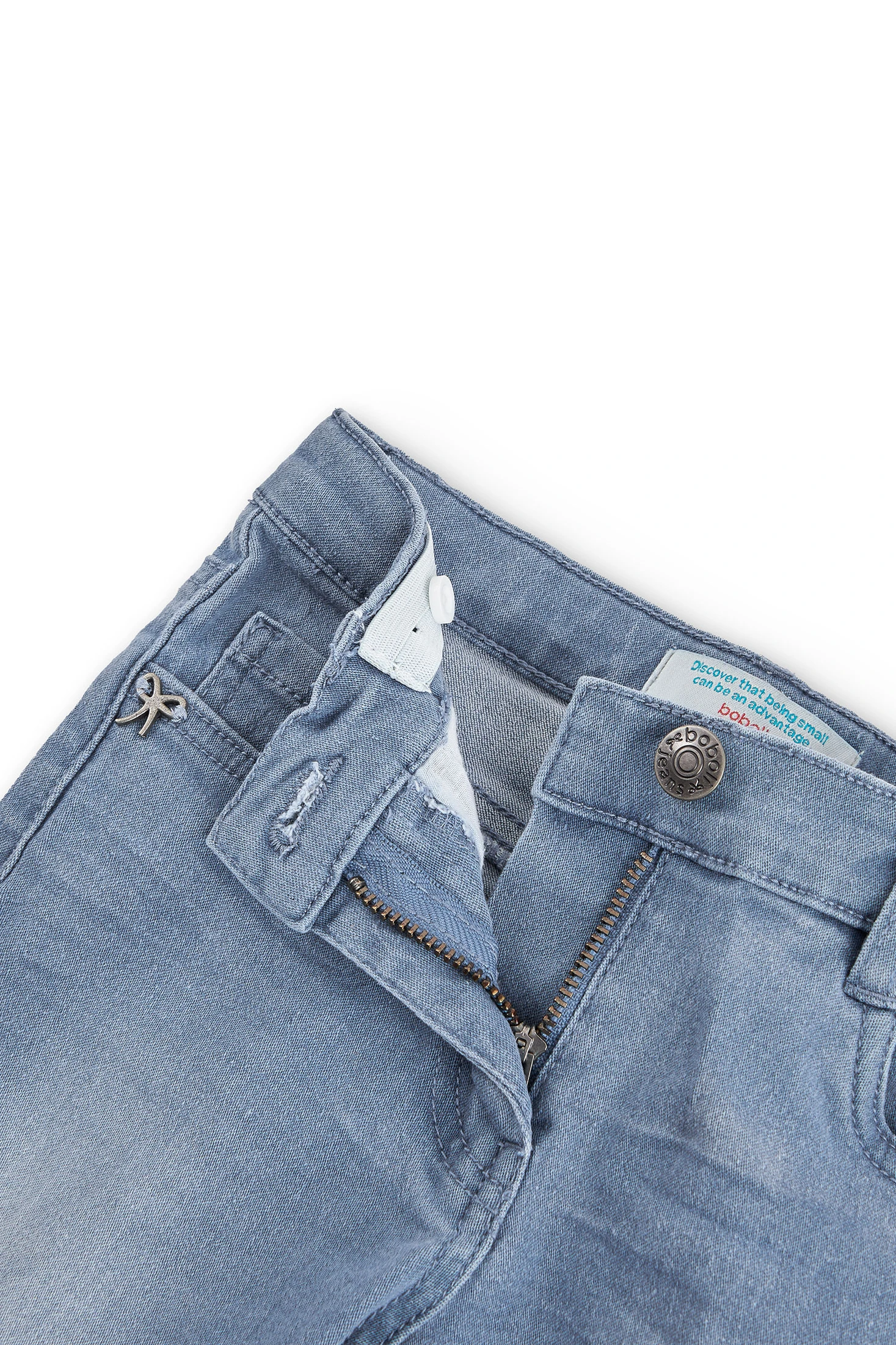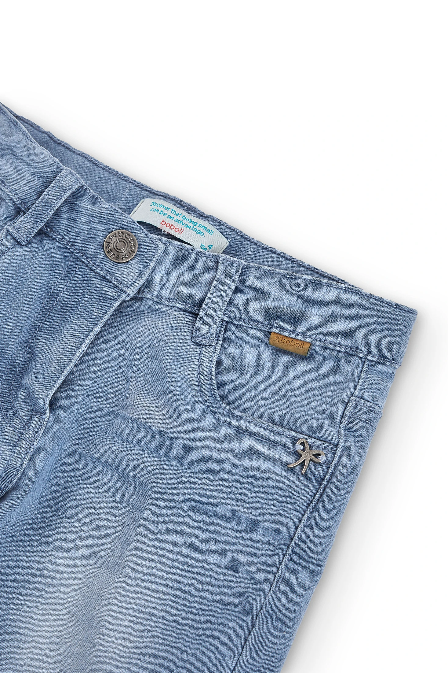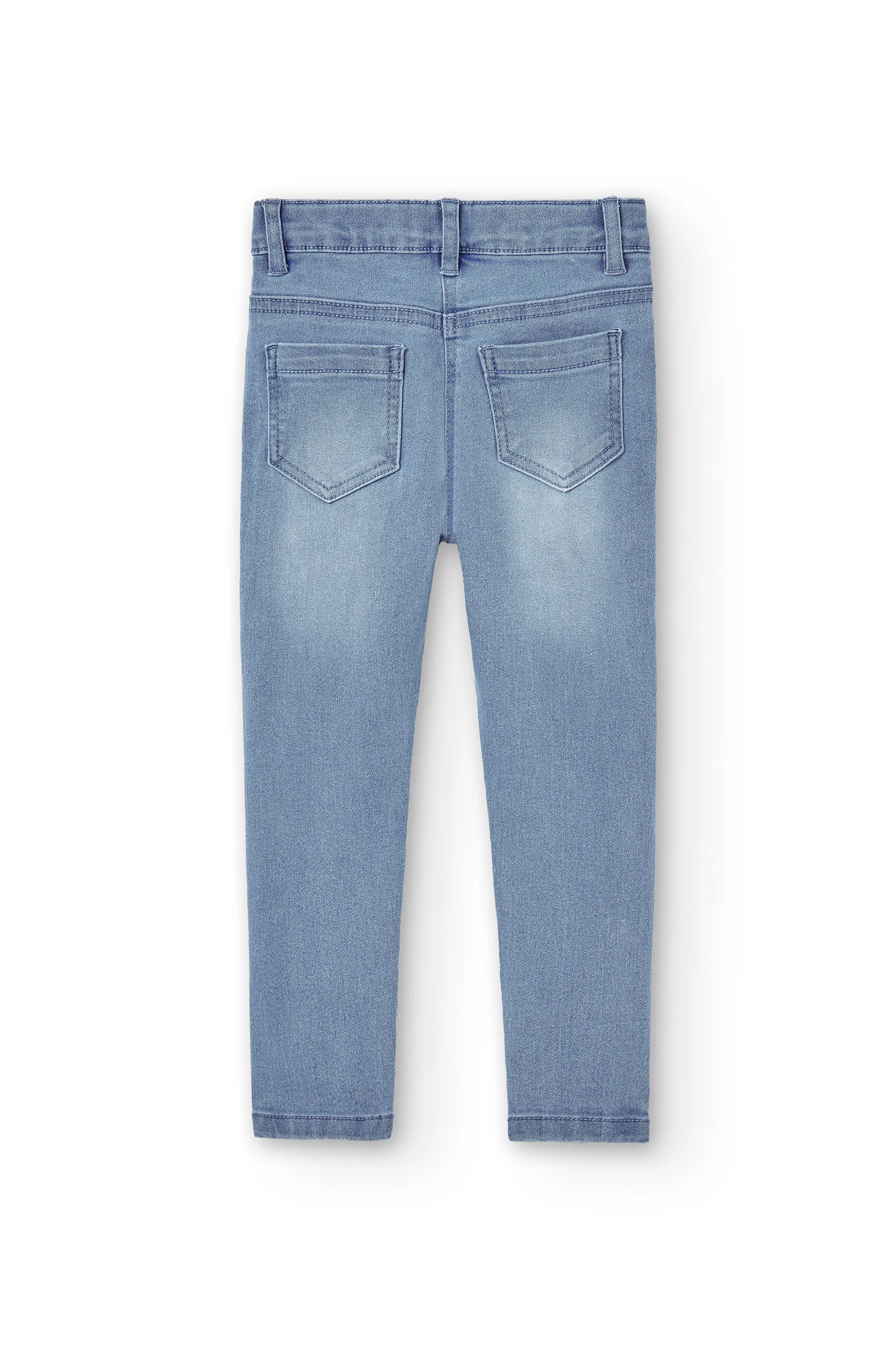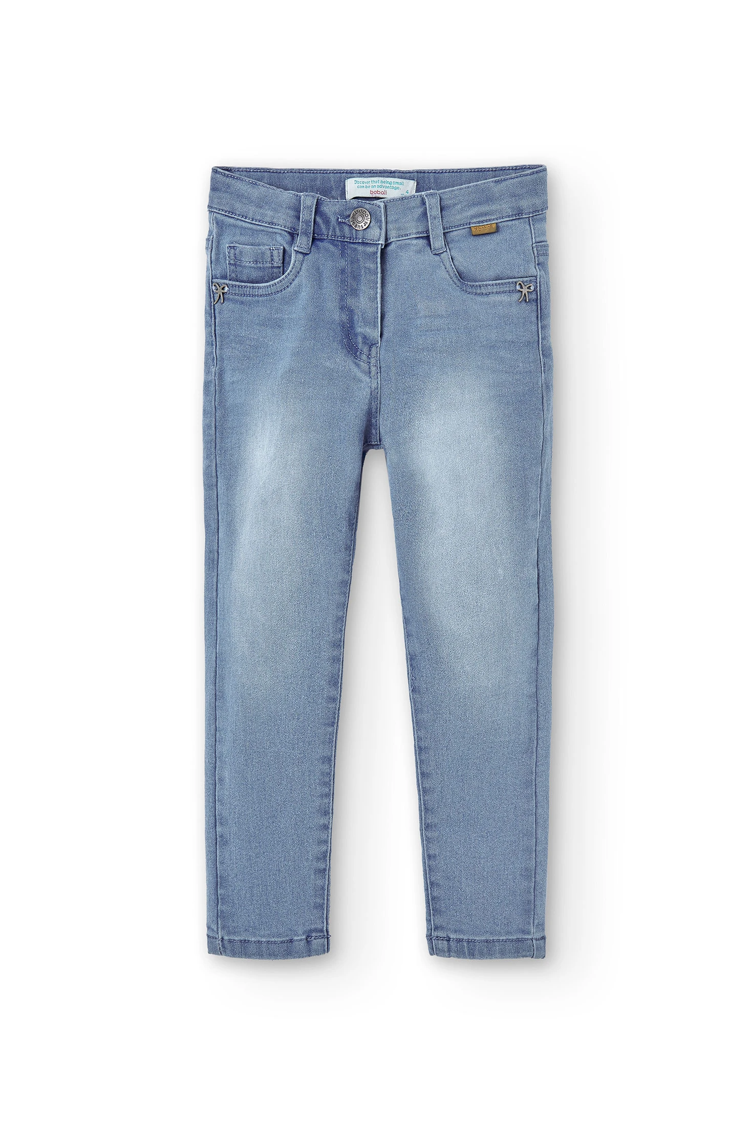 This is a girl's stretch denim trouser, perfect for in-between seasons. It comes in a BLEACH blue colour, with a plain decoration. The fabric is flat, providing comfort and durability. It features a button closure for easy dressing. The sizes available range from 4 months to 16 years, making it a versatile choice for growing girls. This stretch denim trouser is a practical and stylish addition to any girl's wardrobe. It's designed to be both fashionable and functional, making it ideal for everyday wear.