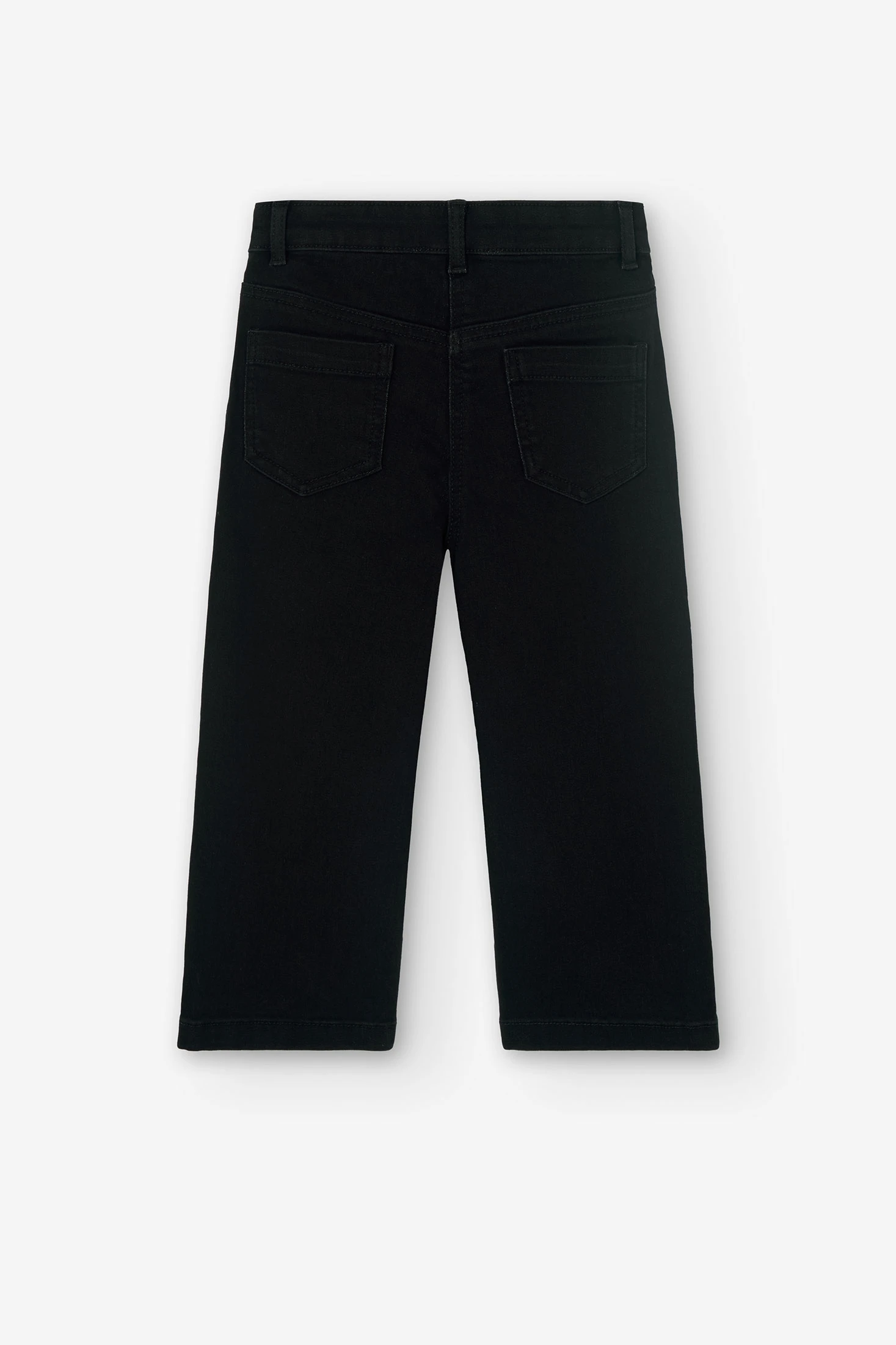 This is a plain, black, stretch denim trouser for girls. It's available in sizes ranging from 4 months to 16 years. The fabric is flat, making it comfortable for everyday wear. It's perfect for in-between seasons, ensuring your child stays stylish all year round. The trousers are easy to put on and take off, thanks to the button closure. This versatile piece can be paired with any top, making it a must-have in your child's wardrobe. Please note, this product does not include any brand names or promotions.