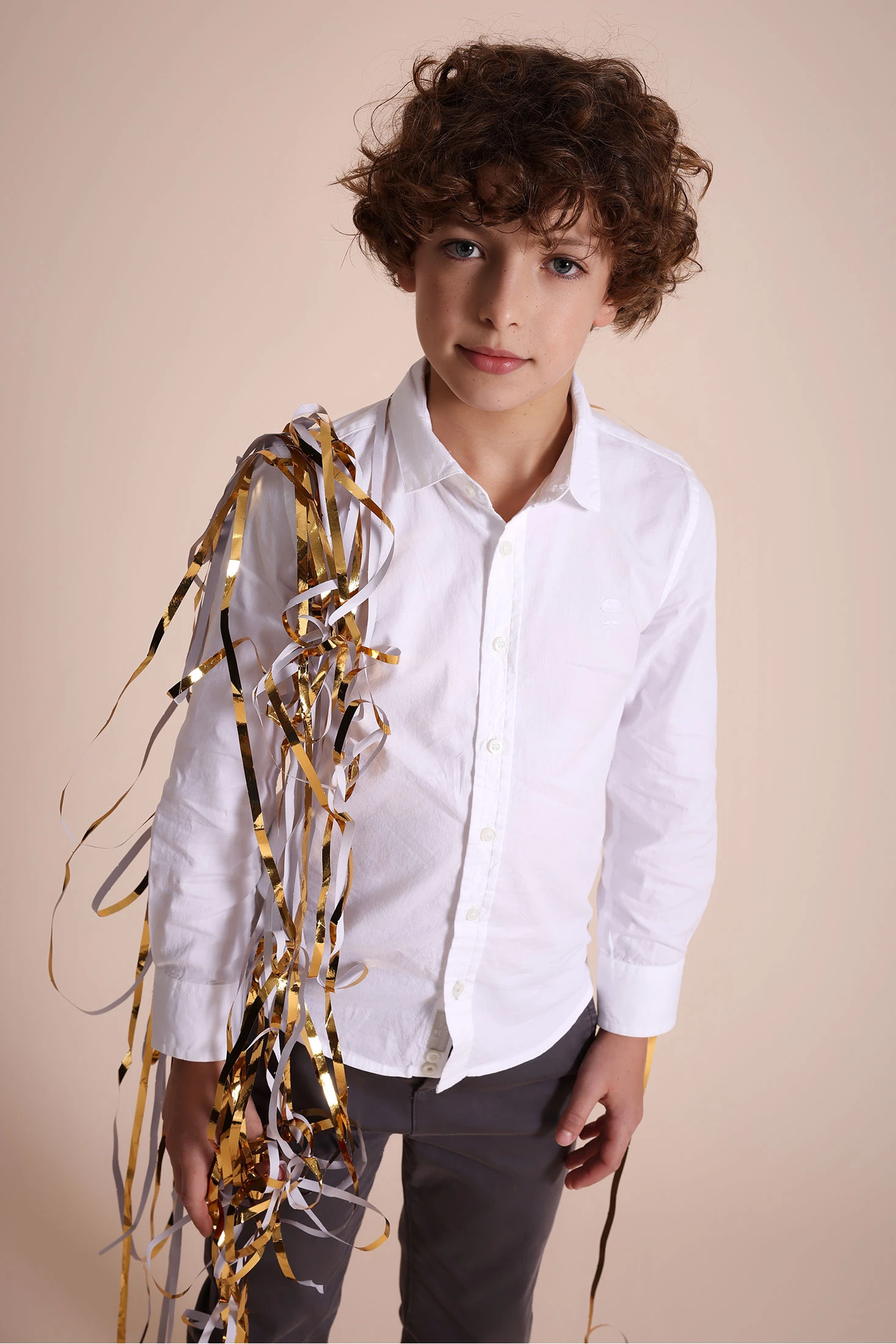 This is a boy's oxford shirt in an attractive white colour, ideal for the spring and summer season. The soft and lightweight fabric provides all day comfort. The shirt features a cute little pineapple print, adding a fun touch to the design. It has a classic collar and button-down cut, making it suitable for both casual and dressier occasions. It is available in a range of sizes for boys from 4 to 16 years old, and is a great choice for pairing with shorts or chinos, ensuring a cool and stylish look.