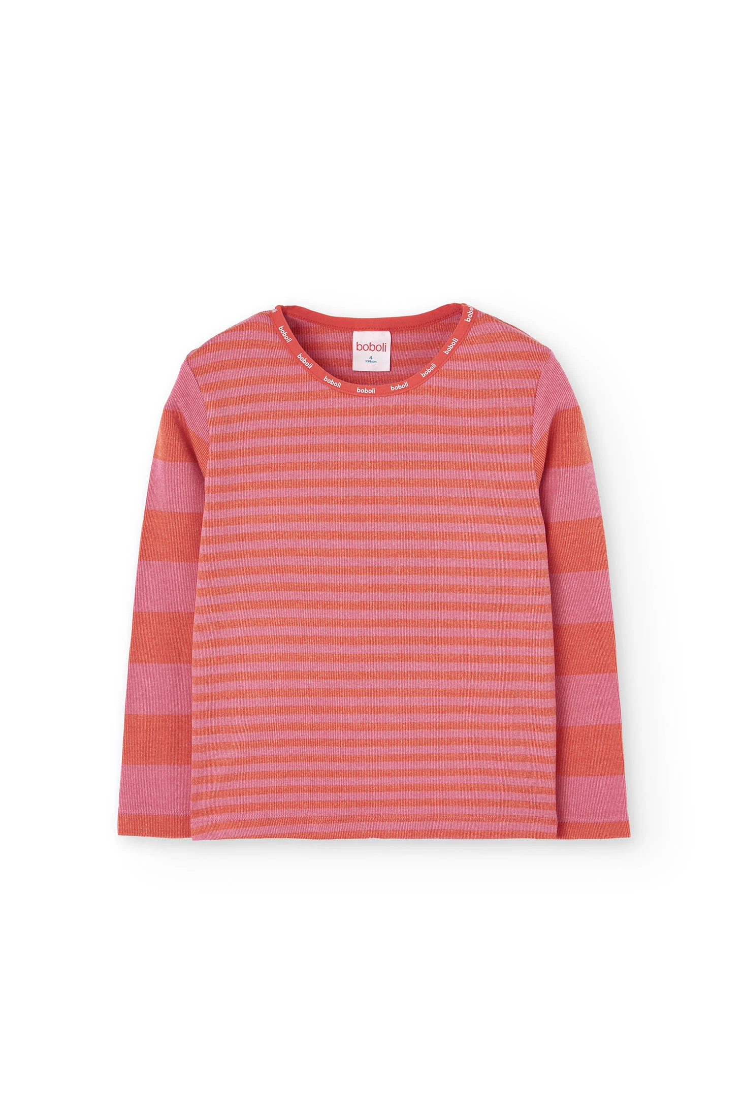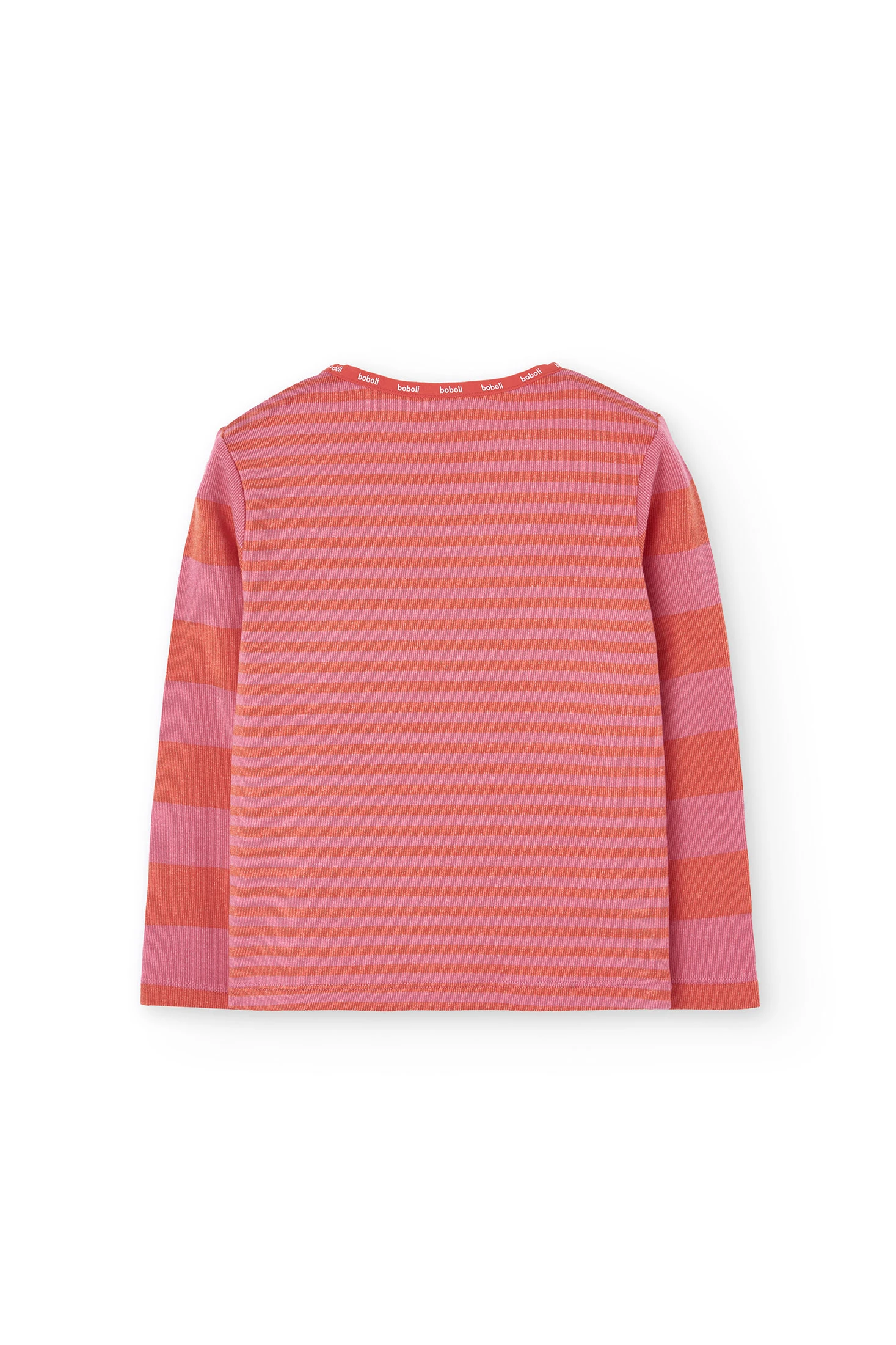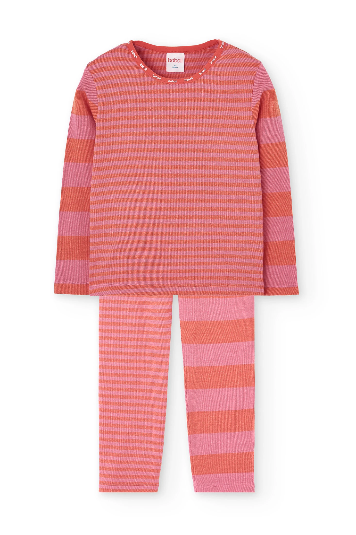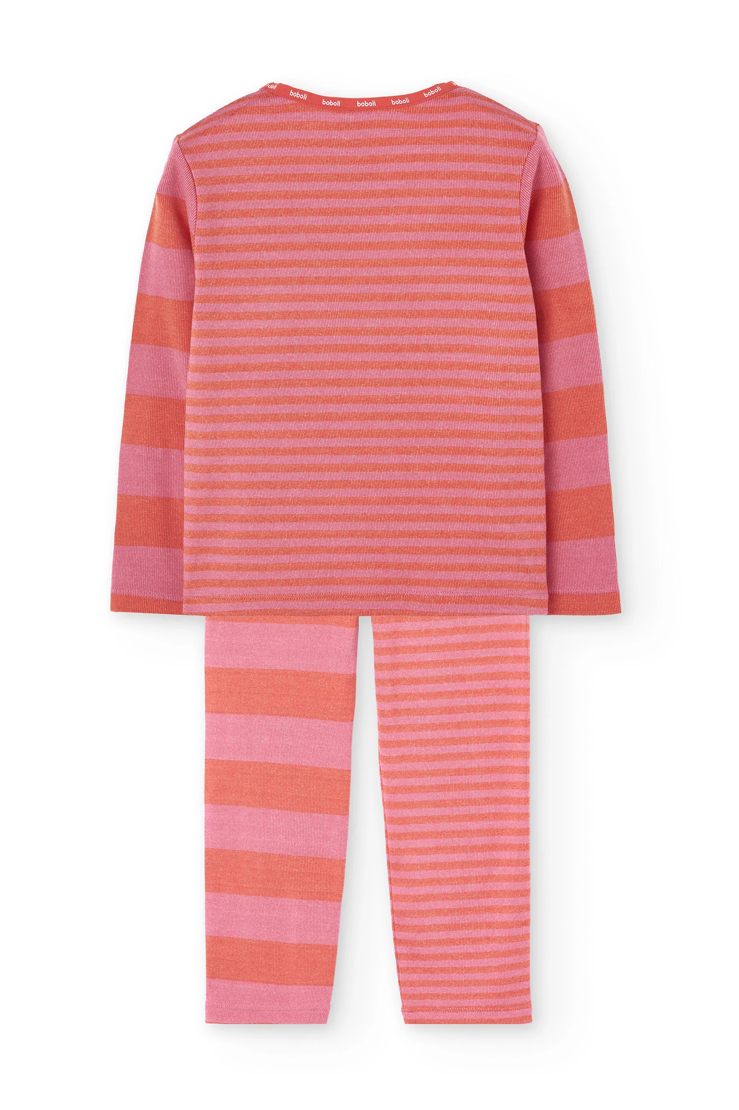 Girl's pyjamas, perfect for the autumn and winter seasons, crafted from a soft ribbed fabric offering warmth and comfort. Its striped design in shades of pink and red adds a cheerful and modern touch, ideal for chilly nights. It features a round neck and long sleeves and is available in sizes from 2 to 14 years. A versatile and stylish garment that complements the little ones' wardrobe with its comfort and appealing splash of colour.